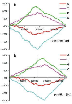 In Fig.7 the asymmetry of the Treponema pallidum genome is presented. For other examples of chromosome asymmetry, see section: Bacterial chromosome asymmetry and Asymmetry of chromosomes in their coding properties.